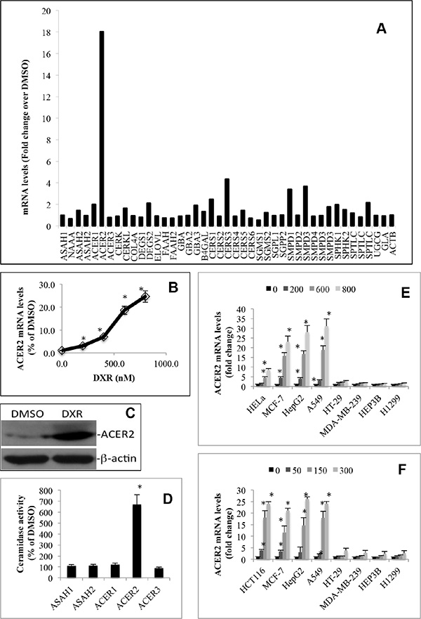 Figure 2: DNA damage upregulates ACER2 in various cell lines. HCT116 cells grown to an 80% confluence were treated with DMSO or DXR at 800 nM for 24 h before total RNA was extracted and subjected to the profiling of mRNA levels of sphingolipid-metabolizing enzymes by a PCR array (A). HCT116 grown to a 75% confluence were treated with DXR at 200, 400, 600, or 800 nM or DMSO for 24 h before the cells were harvested and subjected to qPCR analyses for quantifying ACER2 mRNA levels (B). HCT116 were grown to a 75% confluence and treated with DMSO or DXR at 800 nM for 24 h before ACER2 protein levels were determined by Western blot analyses using anti-ACER2 antibody (C). HCT116 grown to an 80% confluence were treated with DXR at 800 nM or DMSO for 24 h. The cells were harvested and subjected to ceramidase activity assays with the indicated ceramides or ceramide analogues as substrates at pH 4.5, pH 7.4, or pH 8.5 as described in Materials and Methods (D). HeLa, MCF-7, HepG2, A549, HT-29, MDA-MB-231, HEP3A, or H1299 cells were treated with DMSO or DXR at 200, 400, 600, or 800 nM for 24 h before ACER2 mRNA levels were determined by qPCR (E). HCT116, MCF-7, HepG2, A549, HT-29, MDA-MB-231, HEP3A, or H1299 cells were treated with DMSO or 5-FU at 50, 150, or 300 nM for 24 h before ACER2 mRNA levels were determined by qPCR (F). Data represent mean values ± SD of 3 independent experiments. Image data represent one of three experiments. *p-values of DXR vs DMSO.