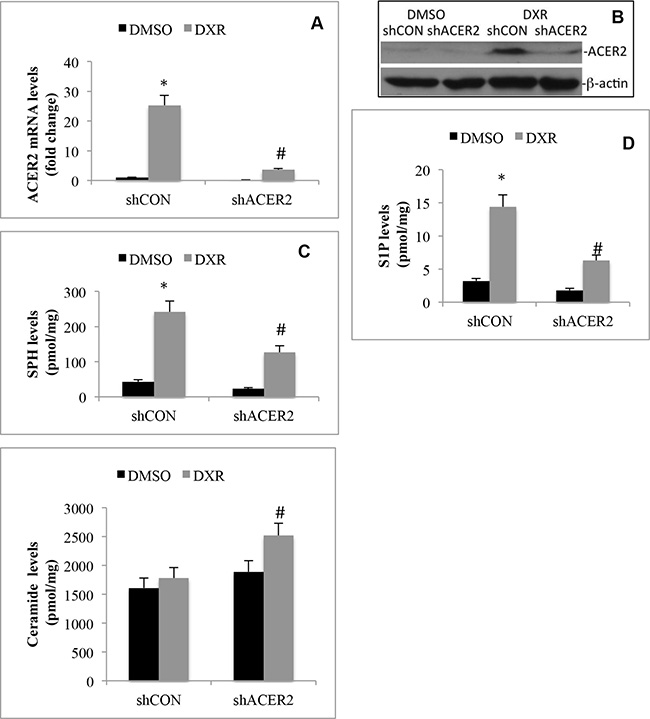 Figure 3: DNA damage increases the generation of SPH and S1P by upregulating ACER2. HCT116 cell lines that stably express ACER2-specific shRNA (shACER2) and a control shRNA (shCON), respectively, were treated with DXR (800 nM) or DMSO for 24 h before ACER2 mRNA levels were measured by qPCR (A), ACER2 protein was analyzed by Western blot analyses (B), and the levels of SPH (C), S1P (D), or ceramides (E) were analyzed by LC-MS/MS. Data represent mean values ± SD of 3 independent experiments. *p-values of DXR vs DMSO, and #p-values of shACER2/DXR vs shCON/DXR.
