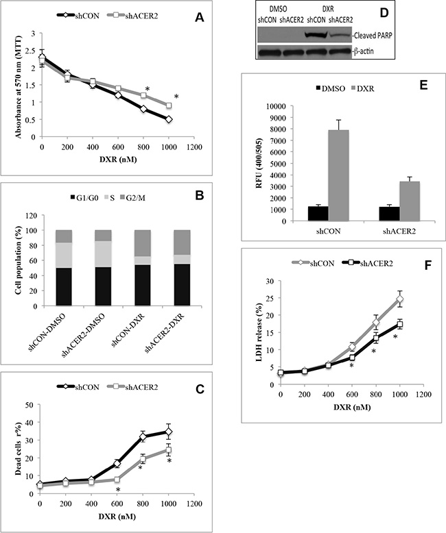 Figure 4: ACER2 knockdown inhibits programmed cell death in response to DNA damage. HCT116 cells stably expressing shCON or shACER2 were treated with DXR at 200, 400, 600, 800, 1000 nM or DMSO for 48 h before being subjected to MTT assays (A). HCT116 cells stably expressing shCON or shACER2 were treated with DXR at 400 nM or DMSO for 48 h before being subjected to cell cycle analyses by flow cytometry (B). HCT116 cells stably expressing shCON or shACER2 were treated with DXR at 200, 400, 600, 800, 1000 nM or DMSO for 48 h before being subjected to PI/AA co-staining (C). HCT116 cells stably expressing shCON or shACER2 were treated with DXR at 800 nM or DMSO for 48 h before Western blot analyses for PARP cleavage (D) or caspase 3 activity assays (E). HCT116 cells stably expressing shCON or shACER2 were treated with DXR at 200, 400, 600, 800, 1000 nM or DMSO for 48 h before being subjected to LDH release assays (F). Data represent mean values ± SD of 3 independent experiments. *p-values of shACER2 vs shCON.