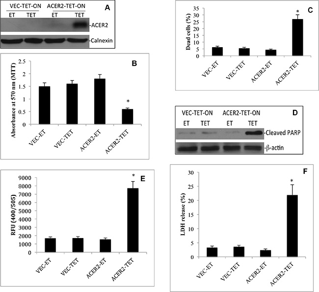 Figure 5: High but not low ectopic expression of ACER2 induces programmed cell death in T-REx™-HeLa cells. VEC-TET-ON or haCER2-TET-ON cells were grown to a 25% confluence before they were treated with TET (20 ng/ml) or ET. At 72 h post treatment with ET or TET, the cells were subjected to Western blot analyses using anti-ACER2 antibody (A), MTT assays (B), PI/AA co-staining assays (C), Western blot analyses for PARP cleavage (D), caspase 3 activity assays (E), and LDH release assays (F). Image data represent one of three experiments. Numeral data represent mean values ± SD of 3 independent experiments. *p-values of ACER2-TET vs ACER2-ET.
