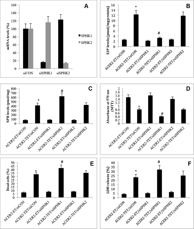 Figure 6: High ectopic expression of ACER2 induces programmed cell death through SPH. haCER2-TET-ON cells at a 25% confluence were transfected with siCON, siSPHK1, or siSPHK2 for 48 h before SPHK1 or SPHK2 mRNA levels were determined by qPCR (A). haCER2-TET-ON cells at a 25% confluence were transfected with siCON, siSPHK1, or siSPHK2 for 24 h before they were treated with ET or TET (20 ng/ml) for 72 h. Post ET or TET treatment, the cells were subjected to LC-MS/MS analyses for the levels of S1P (B) and SPH (C), MTT assays (D), PI/AA co-staining (E), or LDH release assays (F). Data represent mean values ± SD of 3 independent experiments. *p-values of ACER2-TET/siCON vs ACER2-ET/siCON; and #p-values of ACER2-TET/siSPHK1 vs ACER2-TET/siCON.