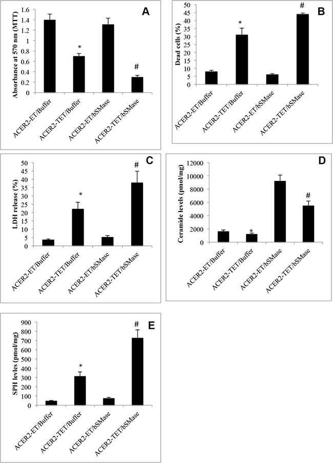 Figure 7: Increasing the generation of ceramides enhances programmed cell death in response to ACER2 overexpression. haCER2-TET-ON cells were grown in the presence of ET/Buffer, TET (20 ng/ml)/Buffer, ET/bSMase (0.2 U/ml), or TET/bSMase for 3 days before MTT assays (A), PI/AA co-staining (B), LDH release assays (C), and LC-MS/MS analyses for the levels of SPH (D) and ceramides (E). Data represent mean values ± SD of 3 independent experiments. *p-values of ACER2-TET/Buffer vs ACER2-ET/Buffer; and #p-values of ACER2-TET/bSMase vs ACER2-TET/Buffer.