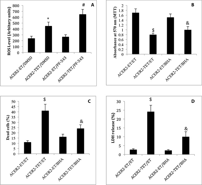 Figure 8: ACER2 overexpression induces ROS production. haCER2-TET-ON cells grown in the presence of ET/DMSO, TET (20 ng/ml)/DMSO, ET/PF-543 (100 nM), or TET/PF-543 for 48 h before ROS levels were assayed (A). haCER2-TET-ON cells were pre-treated with ET or BHA (100 μM) for 2 h before being treated with ET or TET (20 ng/ml) for 48 h. Cells were subjected to MTT assays (B), PI/AA co-staining (C), and LDH release assays (D). Data represent mean values ± SD of 3 independent experiments. *p-values of ACER2-TET/DMSO vs ACER2-ET/DMSO; #p-values of ACER2-TET/PF543 vs ACER2-TET/DMSO; $p-values of ACER2-TET/ET; and and p-values of ACER2-TET/BHA vs ACER2-TET/ET.