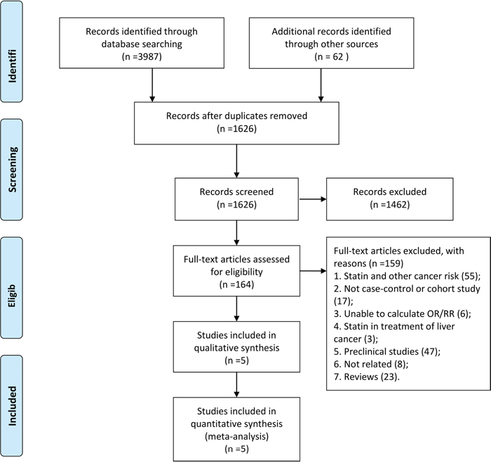 In our trials for meta-analysis, included trials had to meet the following criteria: (1) RCTs, cohort studies or case-control studies; (2) original studies designed to assess the association between the use of statin and the risk of liver cancer with specific classification; (3) interventions: treatment with all kinds of statin treatments or observation alone; (4) population: no prior diagnosis of primary liver cancer or other cancers most likely to metastasize to the liver, such as stomach, colon, breast and so on; (5) risk estimates should be provided or could be calculated with sufficient usable outcomes data. Duplicated or overlap reports were eliminated according to the same title, author list or publication date. If more than one paper was derived from the same population, otherwise, only data from the most recent published report was included. Eligible studies should be published in the form of peer review articles in full length without language restrictions. Eventually, a total of five observational studies were included, which were all published in English though.