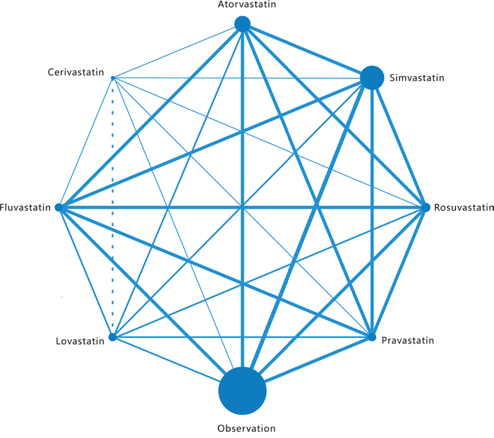 First, we performed a traditional pair-wise meta-analysis which could synthesize studies that compared the same interventions directly by using STATA 12.0 (Stata Corporation, College Station, Texas, USA). Then a Bayesian network meta-analysis to compare different treatments (rosuvastatin, atorvastatin, simvastatin, pravastatin, fluvastatin, cerivastatin, and lovastatin, as well as observation) to each other was followed respectively, with a random-effects model using Markov chain Monte Carlo methods in WinBUGS (MRC Bio-statistics Unit, Cambridge, UK) as described in our previous work [28–30]. The DerSimonian and Laird random effects model was utilized to calculate pooled estimates of hazard ratios (HRs), relative risks (RRs), and 95% confidence intervals (CIs) of direct comparisons between two strategies according to Cochrane Handbook for Systematic Reviews of Interventions Version 5.1.0. Clinical heterogeneity was first assessed through clinical judgment with input from experts in the field. A formal confirmation of heterogeneity was then obtained by referring to the I2 statistic, which if >50% suggested statistically significant heterogeneity, if between 25% and 50% considered moderate heterogeneity levels, and if <25% implied low heterogeneity levels.