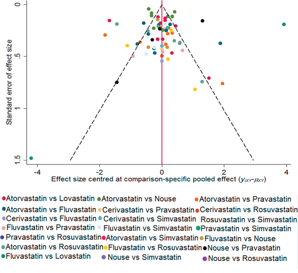 Figure 6: Comparison-adjusted funnel plot. The red dotted line represents the null hypothesis that the study-specific effect sizes cannot differ from the respective comparison-specific pooled effect estimates. The two black dashed lines represent a 95% CI for the difference between study-specific effect sizes and comparison-specific summary estimates. Different colors correspond to different comparisons. yixy is the noted effect size in study i that compares x with y. μxy is the comparison-specific summary estimate for x versus y.