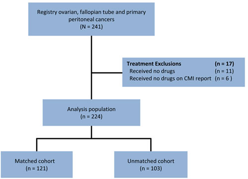 There were 241 EOC patients with advanced stage cancers who underwent treatment and had at least 9 months of follow-up data, diagnostic staging of at least IIIC or having metastasis or treatments prior to profiling. Of 241 eligible patients, 17 were excluded because they received no drugs after the time of tissue collection or the drugs they received were not classified by the molecular profile (received no drugs of predicted benefit or lack-of-benefit; Figure 1).