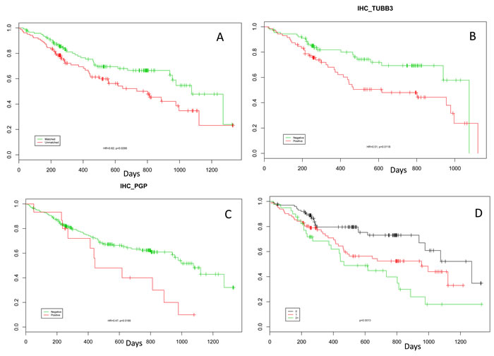 Figure 4: Kaplan-Meier curves: A. Kaplan-Meier curve showing the increase in overall survival from time of profiling for those patients treated only with therapies predicted to be of benefit by their molecular profile compared to those patients who received at least one therapy predicted be lack-of-benefit (HR 0.62, p=0.0295). Kaplan-Meier curves for patients who were positive for TUBB3 (B) and PGP (C). D: Kaplan-Meier curves showing that patients with over-expression of multiple markers have decreased overall survival. The green line shows patients who were positive for two or more biomarkers from the set ERCC1, PGP, RRM1, and TUBB3. The red line shows patients who were positive for only one biomarker from this set. The black line shows patients who were not positive for any biomarkers in this set.
