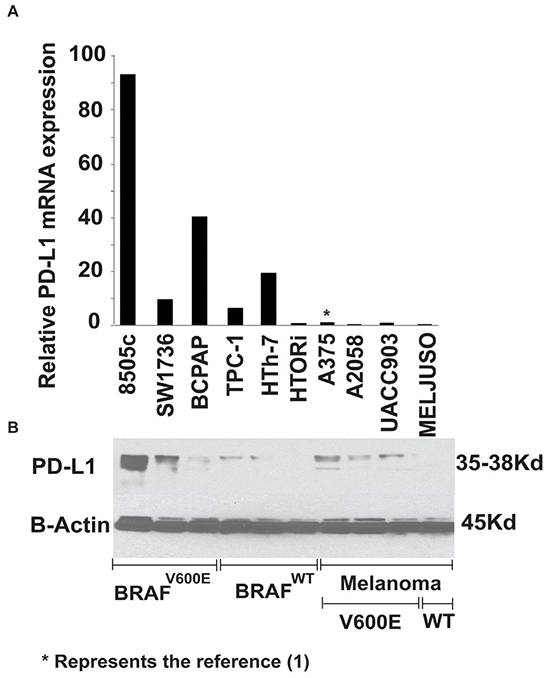 Given the known therapeutic implications of PD-L1 expression in melanoma, PD-L1 mRNA levels in 6 human thyroid cancer cell lines was quantified against 3 BRAFV600E melanoma cell lines (A375,A2058 and UACC903) and one BRAFWT (MelJuso) (Figure 1). BRAFV600E mutant thyroid cancer cell lines showed significantly higher baseline expression of PD-L1 than the BRAFV600E -mutant melanoma cell lines; with 8505c cells showing the highest expression at 93-fold compared with A375 melanoma cells. Thyroid cell lines with the BRAFV600E mutation also showed significantly higher baseline expression of PD-L1 mRNA compared with BRAFWT thyroid cells (P<0.05). In fact, the normal HTORi cell line had the lowest expression of PD-L1. Western blot analysis pointed toward higher PD-L1 protein expression in the mutant BRAF cells compared with wild type across all cell lines investigated.