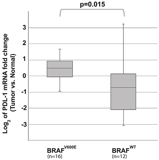 Figure 2: The log2 of the PD-L1 mRNA fold change of tumor vs. adjacent normal tissue in 28 patients. Patients samples carrying BRAFV600E (n=16) showed higher induction of PD-L1 compared to BRAFWT tumors (n=12) (medians: 0.51 vs. -0.70, P = 0.015).