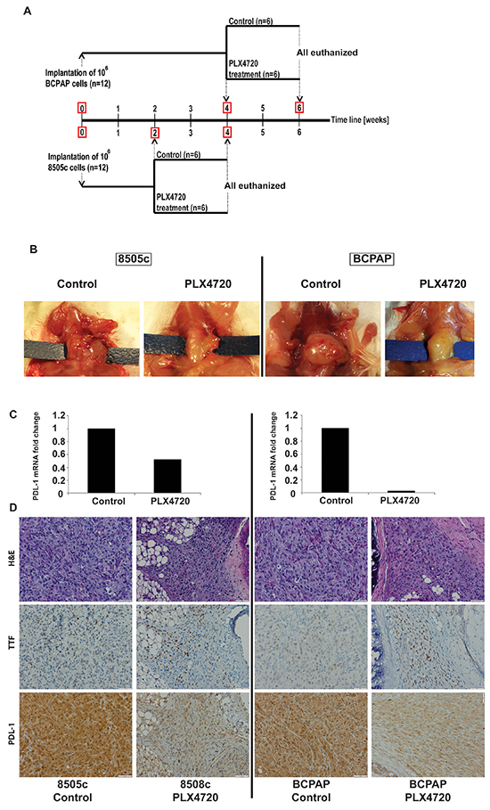 Figure 4: Schedule for the experiment using Orthotropic SCID mouse model for 2 human thyroid cancer cell lines (8505c; ATC derived, and BCPAP; PTC derived cells) is outlined in A. In vivo results of PLX4720 treatment for both cell lines showing obvious tumor volume reduction B. PD-L1 mRNA expression of tumors pooled for each group showing significant reduction of PD-L1 (2 and 37 fold for 8505c and BCPAP respectively) when treated with PXL4720. C. IHC analysis for human PD-L1 showed a marked reduction of staining with PLX4720 treatment for both cell lines D.