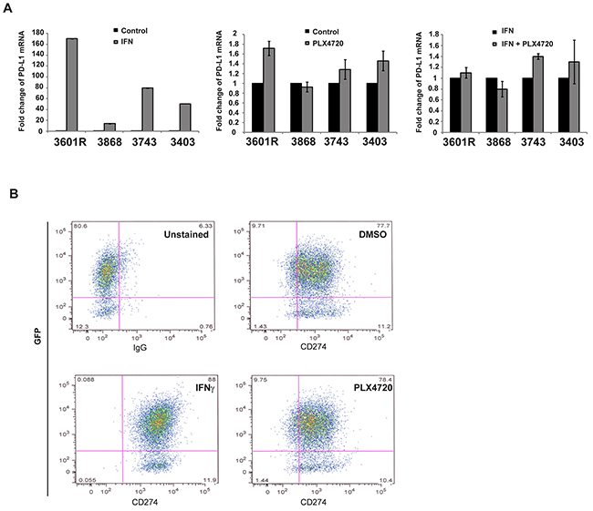 Figure 5: Murine cell lines were treated with PLX4720, IFNγ and the combination of the two. PD-L1 mRNA expression was measured against GAPDH expression and compared to non treated cells. While IFNγ robustly increased PD-L1 mRNA expression in all cell lines, none of the four cell lines exhibited a significant change in PD-L1 expression (<2 fold change) when treated with PLX4720 (compared to control) or with the combination of IFNγ + PLX4720 (compared to IFNγ alone) A. Cell surface analysis of PD-L1 using FACS showed a saturation of PD-L1+ cells while PLX4720 treatment did not differ from DMSO alone. The same result was seen for all four murine cell lines. A representative of one cell line (3743) is shown B.
