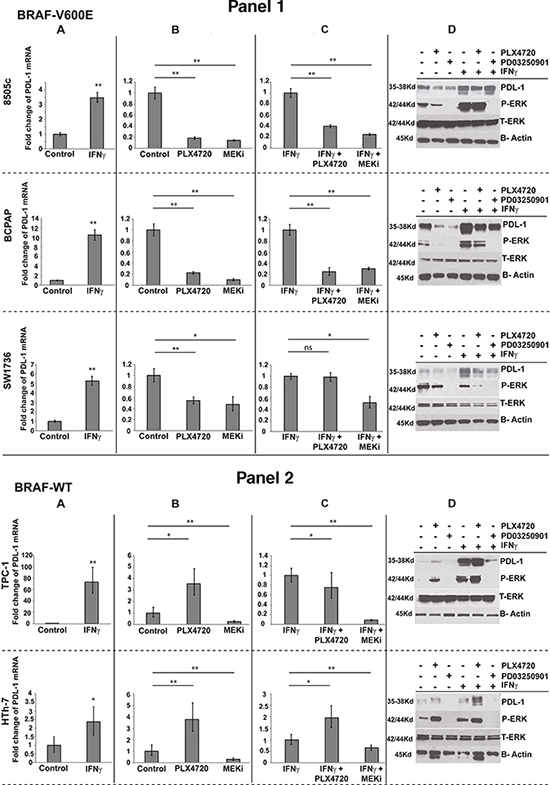 Figure 3: Five human thyroid cancer cell lines were treated for 24 hrs with A. IFNγ. alone B. PLX4720 or PD03250901 alone or in combination with IFNγ C. Quantitative PCR fold change of PD-L1 mRNA was normalized to control (A, B) or to IFNγ treatment state (C). D. Western blot analysis for PD-L1, total ERK, phospho ERK and β-actin were done for all treatment combination mentioned above (* indicate p<0.01, ** indicate p<0.001, ns- not significant).
