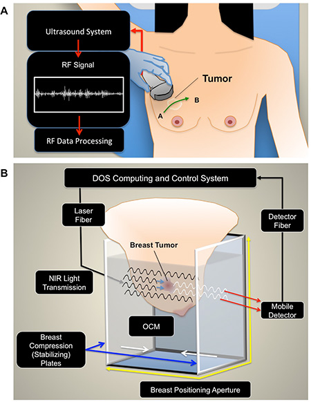 Breast cancer imaging during NAC can provide important clinical information about response to treatment, and potentially impact treatment outcomes if used to guide therapy. Current imaging methods such as x-ray mammography, and conventional computed tomography imaging can be used to study anatomical characteristics, but may be limited in showing functional and biological changes which start to occur early after treatment initiation [10]. Understanding these changes can potentially improve treatment strategies for personalized medicine. In response to these clinical challenges, imaging biomarkers have gained widespread interest in recent years as a potential tool to measure tumor response to NAC. This is due to technological improvements in imaging resolution, contrast, sensitivity and available approaches to assess pathophysiological tumor changes. Research into imaging biomarkers have aimed to match the sensitivity and specificity of gold-standard approaches from immunohistochemistry and microscopy, while providing quantitative and “real-time” results non-invasively. Emerging technologies are demonstrating that imaging biomarkers can detect important tumor characteristics such as cell death, tumor vascularity, and metabolic activity that relate to tumor response [11]. Rousseau et al. measured tumor metabolic activity using 18F-FDG-PET by quantifying the passage and clearance of radioactively labeled metabolites in solid tumors. The study demonstrated significant differences in the standard uptake value between responding/non-responding tumors during treatment [12]. Other developments in MRI-based functional imaging techniques, such as blood oxygenation-level dependent (BOLD) contrast, have indicated some promising results to measure vascular oxygenation as a marker for treatment response in tumors [13]. BOLD-MRI detects T2-weighted signals from deoxy-hemoglobin, and a number of studies to date have explored BOLD-MRI in breast cancer [14, 15]. For example, a pilot study by Jiang et al. demonstrated significant differences in tumor blood oxygen in patients with complete pathological response versus patients with partial response or stable disease to NAC [13]. Other MRI methods relating to tumor vascular perfusion use dynamic contrast-enhanced (DCE)-MRI to predict NAC treatment outcomes. Data reported on 20 LABC patients by Craciunescu et al. showed that predictive models with DCE-MRI parameters could classify pathological responders and non-responders with 91% sensitivity and 78% specificity [16]. Other important contributions in MRI have included diffusion-weighted imaging (DWI) to provide information on tissue microstructure related to cell death and this technique has been exploited for NAC response in breast tumors. Previous studies using DWI-MRI have demonstrated an increased accuracy in classifying patient response to NAC for breast cancer [17]. However, the routine implementation of such specialized methods from MRI and PET is limited by their invasiveness, need for contrast agents, cost, or patient exposure to ionizing radiation [18]. Additionally, other limiting factors include patient motion during imaging and the dependency on other factors such as cardiac output for contrast enhancement, which may affect data stability [13, 19]. There is recent evidence to suggest that imaging markers from quantitative ultrasound (QUS) and diffuse optical spectroscopy imaging (DOSI) can reflect early biological response to chemotherapy. Previous studies have monitored treatment using either QUS or DOSI individually, using both laboratory or commercially based imaging devices [20–23]. Both QUS and DOS imaging modalities have the advantage of being non-invasive, relatively cost effective, quick, and provide functional information about metabolism, physiology, and biological activity.