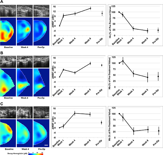 Figure 2: Representative QUS and DOS data of three clinical/pathological responders. QUS and DOS imaging was acquired at weeks 0, 1, 4, 8, and preoperatively, relative to the start of chemotherapy. Representative B-mode images and DOSI parametric maps are presented for baseline, mid-treatment (week 4) and pre-operative scans. Responsive patients demonstrated an overall increase in QUS ultrasound backscatter intensity up to week 8, measured by the mid-band fit. These patients demonstrated a co-incident overall reduction in many DOSI parameters, such as deoxyhemoglobin (presented) during treatment. Error bars = Standard deviation, Scale bars; US = 2 cm, DOS, 2 cm. Deoxy-hemoglobin [Hb] color bar = 0–15 μM. Representative figures presented correspond with Patient No. 10 (2A); No. 8 (2B); No. 6 (2C) [Table 1].