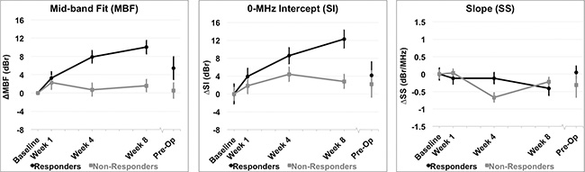 Figure 4: QUS parameters measured. Relative changes resulting from treatment effects are presented in QUS parameters for all patients grouped by clinical response. (A) Mid-band Fit (MBF); (B) 0-MHz Intercept (SI); (C) Spectral Slope (SS). Error bars = Standard deviation, n = 14 responders and n = 8 non-responders. Significant differences between responders and non-responders were tested at each time interval and parametric changes over time were tested for responders and non-responders [Table 2].