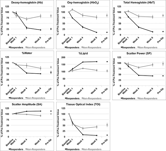 Figure 5: DOSI parameters measured. Percent changes resulting from treatment effects according to clinical response of patients to neoadjuvant chemotherapy. Hemodynamic and tissue changes within the tumor volume are presented. Error bars = Standard deviation, n = 14 responders and n = 8 non-responders. Significant differences between responders and non-responders were tested at each time interval and parametric changes over time were tested for responders and non-responders [Table 2].