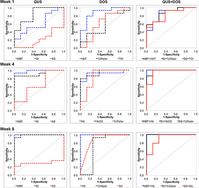 Pairwise combinations were reported with AUC > 0.8. Analyses were performed at week 1, 4 and 8 for combined parameters (i.e. during treatment). Combining QUS and DOSI parameters demonstrated an increase in sensitivity and specificity as early as one week after treatment. Combination pairs were analyzed using a logistic regression model, and the AUC was estimated using a receiver-operating characteristic. A complete list of all pairwise combinations (AUC > 0.8) are presented in Supplementary Table 1.