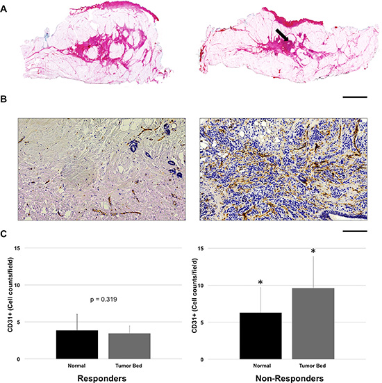 Figure 7: Representative comparison of responder and non-responder based on pathological examination. (A) Reduction in the bulk tumor size in responder (left) and minimal reduction in non-responder (right, arrow); H & E stain, scale bar = 2.0 cm. (B) Reduction in vascular density within the tumor in responder (left) as compared to non-responder (right); CD31 immunostain, Scale bar = 200 μm. (C) Vessel quantification: For non-responders, there was significantly higher vascular staining in the tumor bed compared to normal breast tissue (p < 0.05). In contrast for responders, vessel counts per field showed insignificant differences (p = 0.319) between the tumor bed and normal tissue. Error bars = Standard deviation. *p < 0.05, within group comparison.