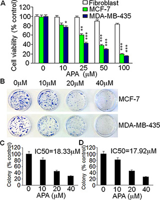 Figure 3: Suppressive effect of APA on cell growth of breast cancer cells in vitro. (A) Cytotoxicity of APA specifically on breast cancer MCF-7 and MDA-MB-435 cells in a dose-dependent manner; (B) Effect of APA on colony numbers of MCF-7 and MDA-MB-435 by a colony forming assay; (C–D) Quantitation of the colony forming assay for MCF-7 (C) and MDA-MB-435 (D) cells.*p < 0.05; **p < 0.01; ***p < 0.001.