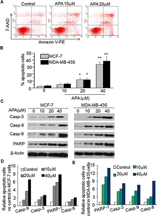 Figure 4: APA induced apoptosis by increasing expression of Casp-3,-8,-9 and PARPin MCF-7 and MDA-MB-435 cells. (A–B) Effect of APA on apoptosis of MCF-7 cells. Cells were stained with Annexin V-PE and the apoptotic cells were analyzed with flow cytometry. (A) is the representative data in MCF-7 cells and (B) is quantitation data for MCF-7 cells and MDA-MB-435 cells; (C) Effect of APA on cleaved Casp3,-8,-9 and PARP by western blot; (D–E) Quantitation of the western data for MCF-7 (D) and MDA-MB-435 (E) cells. *p < 0.05; **P < 0.01.