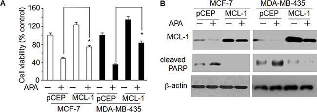 To further understand how APA induces apoptosis, we measured the expression of the BCL-2 family proteins, a group of proteins that regulate the anti- and pro-apoptotic processes [22]. APA treatment down-regulated MCL-1 and BCL-2 proteins in both MCF-7 and MDA-MB-435 cells (Figure 5A). In addition, there was a slight increase in Bax expression following APA treatment (Figure 5A). As MCL-1 was down-regulated in the cells treated with APA, we next sought to demonstrate the functional significance of MCL-1 in APA-induced apoptosis. We transfected MCF-7 and MDA-MB-231 cells with a MCL-1 expression vector and then tested the effects of APA on tumor cell viability and apoptosis. Cells transfected with an empty vector were used as controls. Expression of MCL-1 blocked APA-induced cytotoxic effects on MCF-7 and MDA-MB-435 cells and blocked apoptosis, as evidenced by the near absence of cleaved PARP in MCL-1 over-expressing cells (Figure 6B). These results suggest that downregulation of MCL-1 is necessary for APA-induced apoptosis in breast tumor cells.