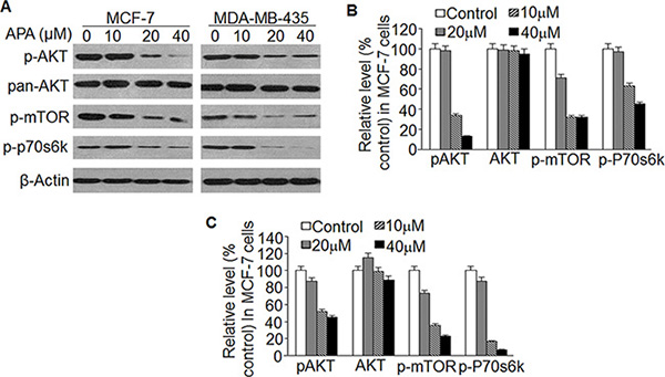 Figure 7: Effect of APA on suppression of the AKT/mTOR pathway (A) Effect of APA on phosphorylation of AKT, mTOR and p70s6k; (B–C) Relative level of p-AKT, p-mTOR and p-p70s6k vs non-treatment control in MCF-7 (B) and MDA-MB-435 (C) cells.