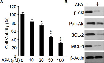 Figure 8: Effect of APA on cell proliferation, p-AKT level, and expression of BCL-2 and MCL-1in primary breast cancer cells. (A) Cytotoxicity of APA specifically on primary breast cancer cells in a dose-dependent manner; *p < 0.05; **p < 0.01. (B) Effect of APA on p-AKT, BCL-1 and MCL-1 in primary breast cancer cells; the level of p-AKT, BCL-1 and MCL-1 was detected by western blot.