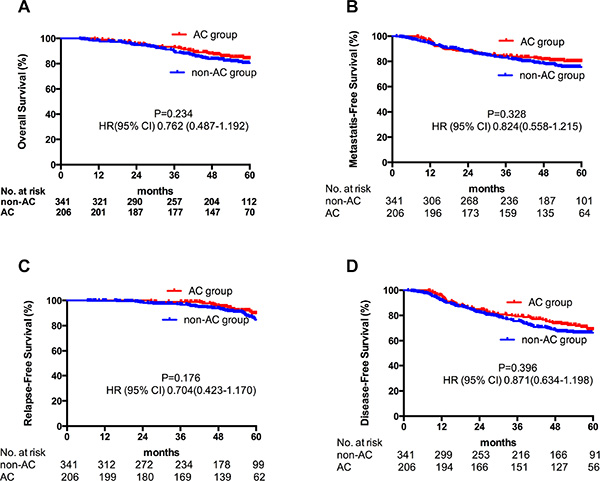 Figure 1: Kaplan-Meier estimate of OS (A), DMFS (B), LRFS (C) and DFS (D) in all N2–3 patients stratified by adjuvant chemotherapy.