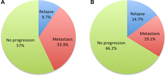 Figure 3: Pie charts of treatment failure patterns of non-AC (A) and AC (B) groups.
