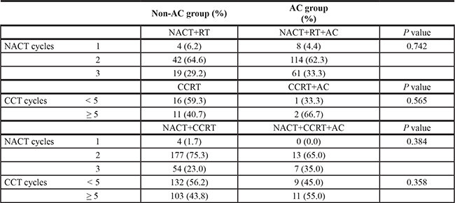 According to the systemic treatment modalities delivered, we classified all 547 patients into non-adjuvant chemotherapy (non-AC) group (341 patients) and adjuvant chemotherapy (AC) group (206 patients). All characteristics except AJCC staging of them were balanced across the two treatment groups in N2–3 population, more stage IVb (N3) patients were prone to receive AC (P = 0.005). In the subgroup analyses of 407 N2 and 140 N3 individuals, with 269 non-AC/138 AC patients and 72 non-AC/68 AC patients included, respectively, all of them had well-balanced characteristics (Table 1A–1B). Table 2A–2B listed all the treatment modalities administered in those patients. Regimens and cycles of chemotherapy delivered had also been particularized in detail. Among the whole population, NACT+CCRT and NACT+RT+AC were the most frequently used regimen in the non-AC group (43.0%) and AC group (33.5%), respectively, and likewise in the N2 (45.0% and 30.5%) and N3 subgroup (37.1% and 42.2%). The cycles of neoadjuvant and concurrent chemotherapy received in different treatment groups were shown in Table 3, and except for the AC, differences of other treatments were not significant.