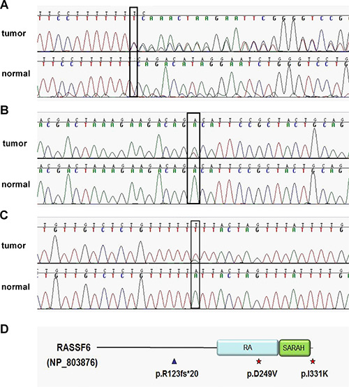 Figure 1: Somatic mutations detected in whole exome sequencing sample and deep sequencing samples. (A) Resequencing of RASSF6 mutation in one of the whole exome sequencing samples. A heterozygous frameshift mutation (c.367insA (T), p.R123fs*20) in exon 5. (B) A heterozygous missense mutation (c.746A > T, p.D249V) in exon 9 identified in one of the deep sequencing samples. (C) A heterozygous missense mutation (c.992T > A, p.I331K) in exon 11. (D) Overview of 3 somatic mutations in protein level. RASSF6 contains two domains: RA domain and SARAH domain. △ represents frameshift mutation while