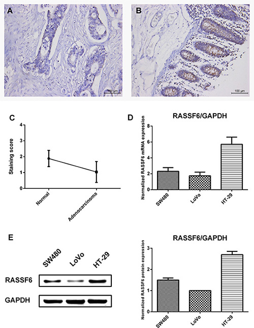 Figure 2: RASSF6 expression in colon tissues and CRC cell lines. (A) Immunohistochemical staining of RASSF6 expression in tissue microarray. Weak or negative staining for RASSF6 was detected in adenocarcinoma. (B) Adjacent benign glands were showing strong RASSF6 staining. (A and B) are representative images from the same patient. (C) Comparison of staining score between 52 cases of adenocarcinoma and adjacent normal tissue. Staining score is classified as weak or negative (0), mild (1), moderate (2), and strong (3) (***P < 0.001, paired t test). (D) Transcriptional level of RASSF6 in colorectal cancer cell lines (SW480, LoVo, and HT-29) was analyzed using quantitative real time-PCR. RASSF6 was expressed in all cell lines, relatively high in HT-29 cells and low in LoVo cells, with GAPDH as the normalized reference gene. (E) Western blot analysis of RASSF6 protein levels that normalized to GAPDH expression. The result is consistent with transcriptional level analysis. All data are shown as mean ± SE.