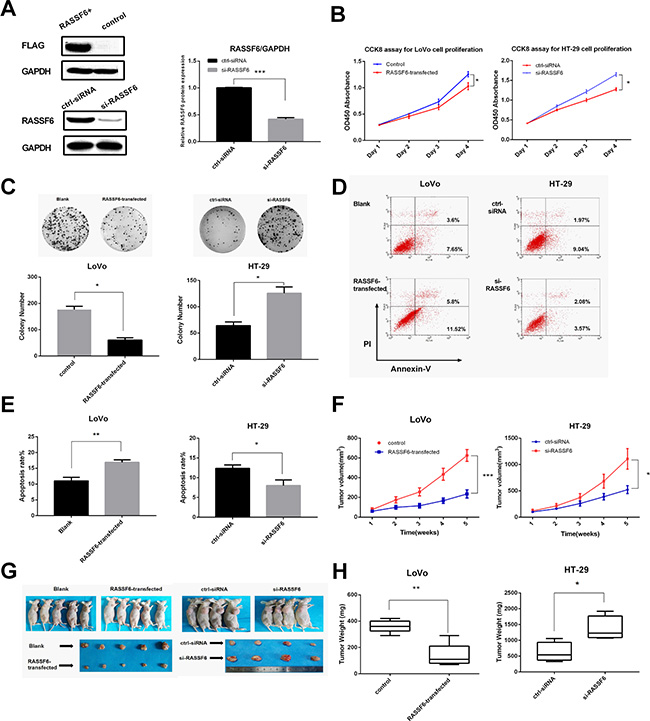 Figure 3: RASSF6 inhibits cancer cell proliferation and induces apoptosis. (A) The overexpression and knockdown efficiency were confirmed by western blot, with anti-flag antibody and specific anti-RASSF6 antibody used respectively. (B) LoVo and HT-29 cell proliferation was determined by CCK8 assays after transfection, on day 1, 2, 3, 4. (C) The effects of RASSF6 on the colony forming ability of LoVo and HT-29 cells. Images are representative of three independent experiments. (D and E) The effects of RASSF6 on LoVo and HT-29 cells apoptosis was detected by flow cytometry. (F) Tumor volume was assessed once a week with a total period of 5 weeks (n = 5 or 4). (G) Images of nude mice bearing the tumors and isolated tumors from injected mice. (H) Weights of the isolated tumor (n = 5 or 4). All data are showed as mean ± SE. *P < 0.05, **P < 0.01, ***P < 0.001.