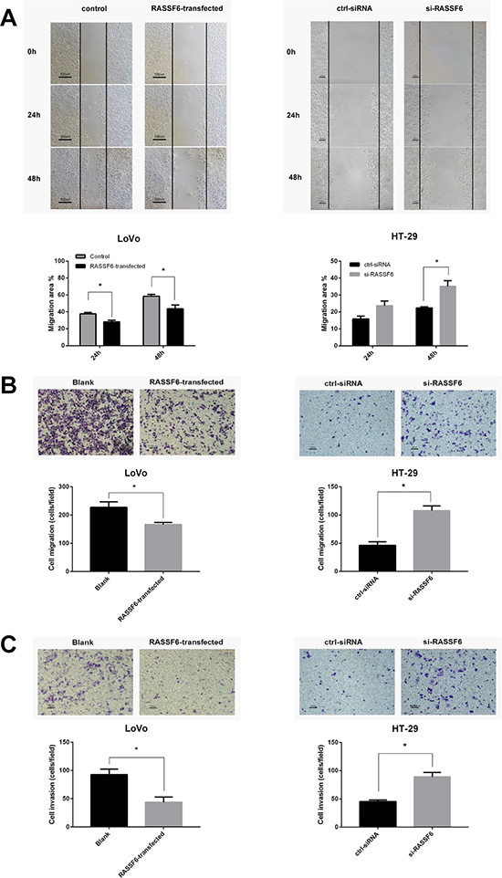 Figure 4: RASSF6 inhibits the migration and invasion ability of colorectal cancer cells. (A) Wound scratch assays were performed in LoVo cells with transfection of empty vector as control or RASSF6 (Left, A), and HT-29 cells with transfection of scrambled control siRNA or RASSF6 siRNA respectively. Images were visualized at 0 h, 24 h, and 48 h at a magnification of 100 ×. RASSF6 highly-expressed cells showed lower migration ability than RASSF6-low cells. (B) The migration ability was also assessed using Transwell chamber without Matrigel (18 h for LoVo and 48 h for HT-29 cells). (C) The effects of RASSF6 on the invasion ability of cancer cells were assessed by Matrigel-invasion assay (24 h for LoVo and 48 h for HT-29 cells). Representative images were visualized at a magnification of 100 ×. All data are showed as mean ± SE of three independent experiments, and for every single experiment, the data are mean of at least three fields, *P < 0.05.