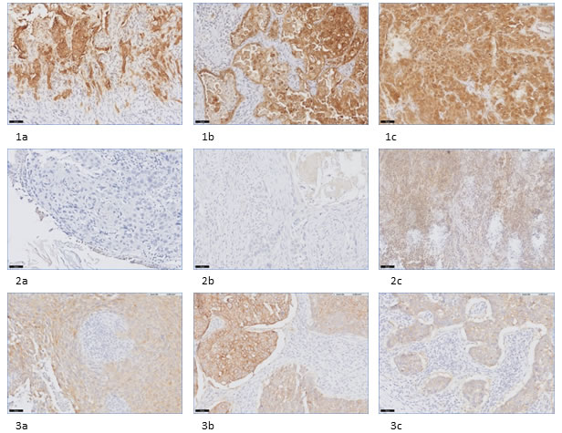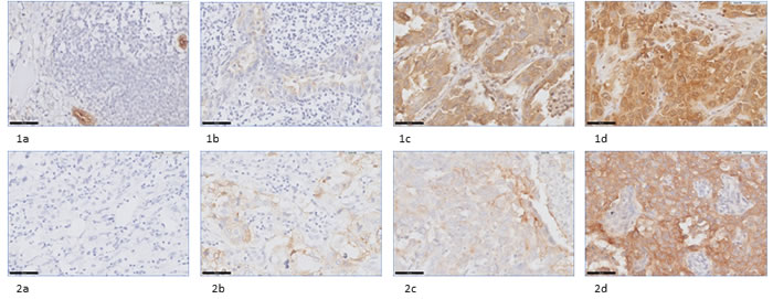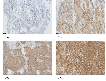 FRα expression was assessed in both lung and breast cancer tissue by using a membranous scoring method with a scale ranging from 0 to 3+, as described by O’Shannessy et al. [14]. A score of 0 corresponded with absence of staining; 1+ equaled faint staining on luminal borders; 2+ equaled moderate staining on apical and sometimes lateral borders and 3+ indicated strong circumferential staining (Figure 1). The tumor was considered positive when more than 10% of malignant cells were positively stained (>0). Overexpression of FRα was defined as a score of 2+ or 3+. Homogeneity was described when FRα expression was detectable on all malignant cells. Concordance was achieved when the expression score of one of the stained tissues, i.e. biopsy or corresponding LN or distant metastasis, matched the score of the primary tumor and both displayed either positive or negative expression of FRα. In general, FRα expression of the primary tumor specimen was considered as golden standard. Concordance between either biopsy or metastatic tissue with the primary tumor was described as down- or upregulation of FRα. False positive expression was determined as positive FRα expression on biopsy or metastatic tissue without FRα expression on the primary tumor. Evaluation of the immunohistochemical staining was performed blinded independently by two observers. Disagreements were resolved by consensus after reviewing the relevant slide with the pathologist.