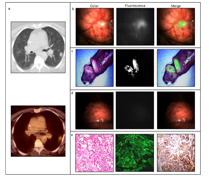 Figure 4: Example of FRα-targeted detection of an adenocarcinoma using EC-17, i.e. fluorescent FRα-targeted molecular agent, in a patient suffering from NSCLC. In vivo fluorescence imaging was performed using the Artemis imaging system [34]. a: Prior to pulmonary resection, a tumor of 3 cm in the upper lobe of the left lung is detected by CT-and PET-scan. b: In vivo fluorescence imaging shows clear tumor delineation. c: Ex vivo fluorescence imaging of the tumor in the resected specimen. d: After resection, the wound bed was inspected with λex 490 nm and demonstrated no residual fluorescence at the surgical margins. e: FRα upregulation was confirmed by fluorescence microscopy and immunohistochemical staining.