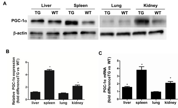 Figure 1: Characterization of PGC-1α transgenic mice. A. PGC-1α protein levels in the liver, spleen, lung, and kidney. B. Densitometric analysis of PGC-1α protein levels. C. Ratio of PGC-1α mRNA levels in the kidney cortex and other tissues from TG mice compared with WT controls, as determined by qRT-PCR. The results are presented as means ± SE (n = 8). *P < 0.05 vs. WT Cntl.