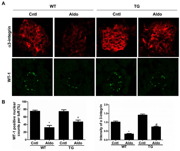 Aldo treatment slightly but significantly reduced PGC-1α expression at the mRNA (Figure 2B) and protein (Figure 2C) levels in the kidneys of WT mice. However, kidney PGC-1α expression was significantly higher in TG mice than in WT controls, irrespective of Aldo treatment (Figure 2B and 2C). PGC-1α transgenic mice exhibited improved albuminuria (Figure 2D), while the kidney function evidenced by BUN, blood creatinine and creatinine clearance displayed no difference between genotypes with or without Aldo treatment (Figure 2E-2G). In line with the reduced proteinuria, EM indicated obviously ameliorated podocyte foot process effacement in PGC-1α TG mice following 2 weeks of Aldo infusion (Figure 2H). We then examined the glomerular morphology by PAS staining and found that Aldo-infused WT mice showed slight glomerular enlargement and a larger mesangial area, but these changes were not observed in TG mice (Figure 2I). Immunofluorescence indicated significantly fewer WT-1-positive cells in Aldo-treated WT mice, whereas this reduction was significantly attenuated in TG mice (Figure 3A and 3B), suggesting an improvement in podocyte depletion. Subsequently, we examined α3-integrin expression by Western blotting and immunofluorescence and found that Aldo significantly decreased the expression of α3-integrin (an important protein for maintaining podocyte integrity) in WT mice, and this decrease was remarkably blunted in PGC-1α TG mice (Figure 3A and 3B and Figure 4A and 4B). The pattern of nephrin expression was similar to that of α3-integrin expression (Figure 4A and 4B). In addition, the Aldo-induced reduction in desmin expression was blunted in PGC-1α TG mice (Figure 4A and 4B).