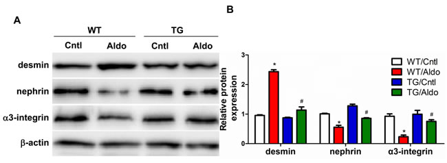 Figure 4: Overexpression of PGC-1α blocked podocyte phenotypic changes in aldosterone-infused mice. A. Representative immunoblots of desmin, nephrin, and α3-integrin. B. densitometric analysis. The results are presented as means ± SE (n = 4). *P < 0.05 vs. Cntl. #P < 0.05 vs. Aldo+WT.