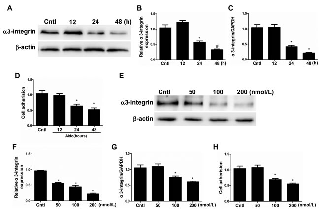 Figure 6: Aldo induced podocyte detachment. Cells were grown on 6-well plates until 80% confluence and then treated with Aldo (100 nmol/l) for 12 h, 24 h, and 48 h (A-D) or various doses of Aldo (50, 100, and 200 nmol/l) for 24 h (E-H). A. Western blotting analysis of α3-integrin. B. densitometric analysis of α3-integrin. C. qRT-PCR analysis of α3-integrin. D. Cell adhesion was analyzed using an ECM Cell Adhesion Assay. E. Western blotting analysis of α3-integrin treated by different dose of Aldo. F. densitometric analysis of α3-integrin. G. qRT-PCR analysis of α3-integrin. H. Cell adhesion was analyzed using an ECM Cell Adhesion Assay. The results are presented as means ± SE (n = 4). *P < 0.05 vs. Cntl.