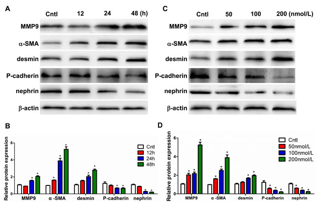 Figure 7: Aldo induced podocyte phenotypic changes in a time- and dose-dependent manner. Cells were grown on 6-well plates until 80% confluence and then treated with Aldo (100 nmol/l) for 12 h, 24 h, and 48 h or various doses of Aldo (50, 100, and 200 nmol/l) for 24 h. A., C. Representative immunoblots of MMP9, α-SMA, desmin, P-cadherin, and nephrin protein expression by Western blotting. B., D. densitometric analysis. The results are presented as means ± SE (n = 4). *P < 0.05 vs. Cntl.