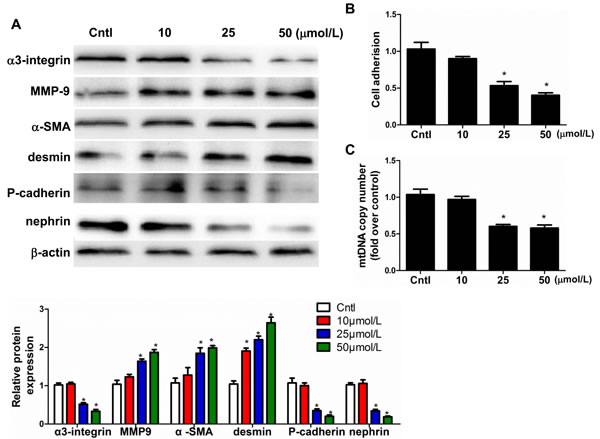 Figure 8: Mitochondrial dysfunction induced podocyte detachment. Cells were grown on 6-well plates until 80% confluence and then treated with EtBr (10, 25, and 50 µmol/l) for 24h.A. Western blotting analysis for α3-integrin, MMP-9, α-SMA, desmin, P-cadherin, nephrin, Upper: representative immunoblots. Lower: densitometric analysis. B. Cell adhesion was analyzed using an ECM Cell Adhesion Assay. C. mtDNA copy number. The results are presented as means ± SE (n = 4). *P < 0.05 vs. Cntl.