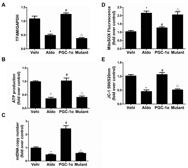 Figure 10: Overexpression of PGC-1α in podocytes blocked Aldo-induced mitochondrial dysfunction. Cells were grown on 6-well plates until 30% confluence, transfected with lentivirus expressing PGC-1a and mutant plasmid for 24 h, and then treated with Aldo (200 µmol/l) for another 24 h. A. qRT-PCR analysis of TFAM, B. adenosine 5’-triphosphate (ATP), and C. mitochondrial DNA (mtDNA) copy number. D. Mitochondrial ROS levels. E. Mitochondrial membrane potential content. The results are presented as means ± SE (n = 4). *P < 0.05 vs. Cntl. #P < 0.01 vs. Aldo group. #P < 0.05 vs. PGC-1α overexpression group.