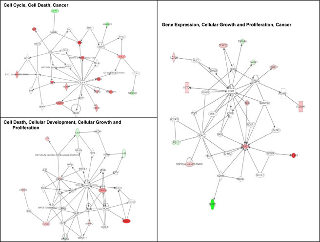 Figure 4: Signaling networks affected by the R87P-p16 mutation. Networks of differentially-expressed genes altered at baseline in familial SFs with a R87P-p16 mutation (Group 3) were generated using Ingenuity Pathway Analysis software. Genes upregulated or downregulated in Group 3 (vs. Group 1) were highlighted in red or green, respectively.