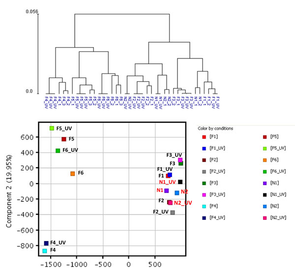 Figure 6: Hierarchical clustering and principal component analysis of gene expression data from SF cultures before and after UV irradiation. Unsupervised hierarchical clustering (upper panel) and principal component analysis (lower panel) were performed on gene expression data from un-irradiated and UV-irradiated SF cultures from the three cohorts using normalized expression data of all probes.