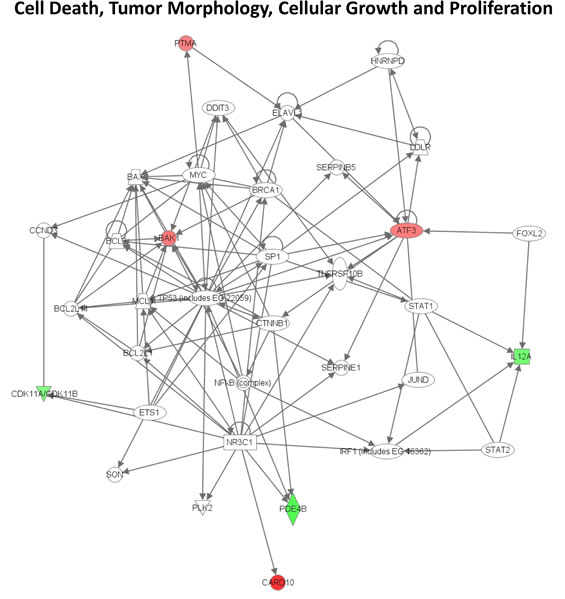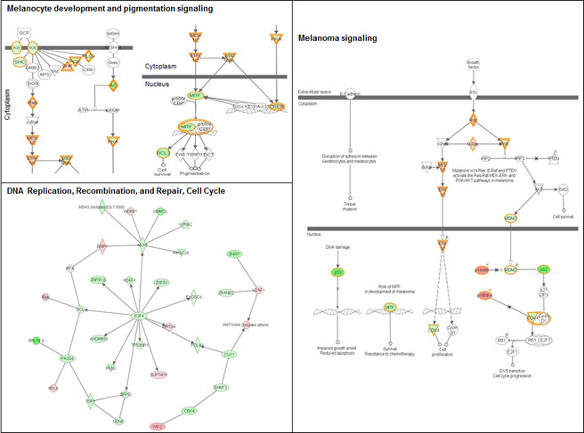 Figure 9: Signaling networks affected by UV in familial SFs with a R87P-p16 mutation. The gene networks were generated using Ingenuity Pathway Analysis software. Genes upregulated or downregulated by UV in Group 3 were highlighted in red or green, respectively.