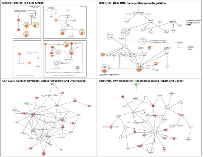 We then performed an IPA analysis of the genes regulated by UV. Genes associated with cell cycle regulation were over-represented in UV-affected genes in both Group 2 and Group 3 SF cultures (Table 2; Figures 8 and 9). As shown in Figure 8, some of the genes specifically altered in Group 2 are associated with cell death, growth and proliferation as well as tumor morphology. Some of the genes specifically altered in Group 3 are associated with regulating the mitotic roles of polo-like kinases and G2/M damage checkpoints as well as with DNA repair and cancer (Figure 9). Interestingly, cell cycle regulatory pathways are overrepresented in both UV-treated Group 2 and 3 cultures, even though the overall gene expression profile at baseline in Group 2 SF is similar to control Group 1. In contrast to FM mutation carriers, and perhaps, most importantly, the expression of genes associated with cell cycle regulation was not altered after UV-irradiation of SF from normal controls (Group 1).