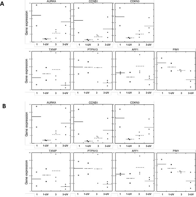 To further determine the biological significance of our findings, we compared UV-treated, differentially expressed gene sets in FM fibroblasts with published datasets that account for melanoma development. Thus, genes upregulated in melanoma (Omnibus datasets GDS1375 and GDS1989), were also found to be enriched in UV-upregulated genes of Group 3 SF cultures (Fisher’s exact one-tailed P value = 0.0158). Similarly, genes downregulated in melanoma were found to be enriched in UV-downregulated genes of Group 3 SF cultures (Fisher’s exact one-tailed P value = 0.0043). These differences were not seen in the case of SF from group 2 vs. melanoma. An IPA analysis showed that genes coordinately regulated by UV in Group 3 (UV vs. untreated) SF cultures and in melanoma (vs. normal skin) are involved in cell cycle regulation and apoptosis (Table 2). We therefore validated that the gene expression of AURKA, CCNB1 and CDKN3 was upregulated upon UV-irradiation of Group 3 FM SF cultures (Figure 10A) and compared the expression of these genes in normal skin and melanoma tissue (Figure 10B). As shown in Figure 10B the expression of AURKA, CCNB1 and CDKN3 was enhanced in melanoma tissue as compared to their expression in normal donor skin. In addition, the expression of AFF1, PIM1, PTPN13 and TXNIP was downregulated in UV-irradiated FM SFs with a R87P-CDKN2A mutation (Figure 10A), and the expression of these genes was also found to be downregulated in melanoma tissue (Figure 10B).