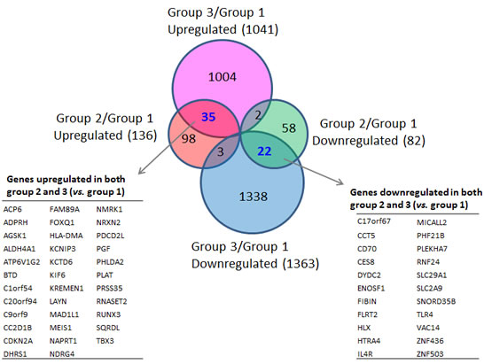 Figure 2: Differentially-expressed genes in familial SFs with distinct CDKN2A mutations. The inserted tables in the Venn Diagrams list the genes coordinately upregulated (left panel) or downregulated (right panel) in both Group 2 and Group 3 SFs in comparison to normal SFs (Group1).